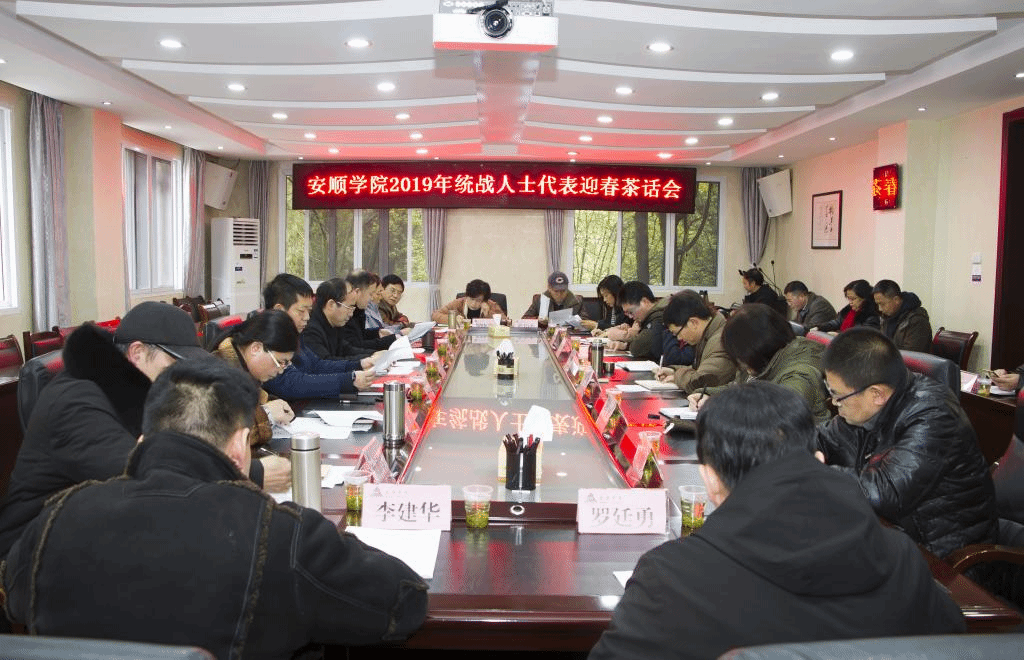 1月9日下午,安顺学院2019年统战人士代表迎春茶话会暨党委民主生活会征求意见会在学校会议室举行。安顺学院党委书记罗荣彬、校长吴次南、党委副书记陶文彩出席会议。学校各民主党派主要负责人,无党派人士代表,市、区政协委员,台属代表,侨联、留联会、知联会负责人,安顺学院党政办、组织部、宣传部、统战部、人事处、计财处等相关职能部门负责人参加会议。会议由安顺学院党委陶文彩副书记主持。