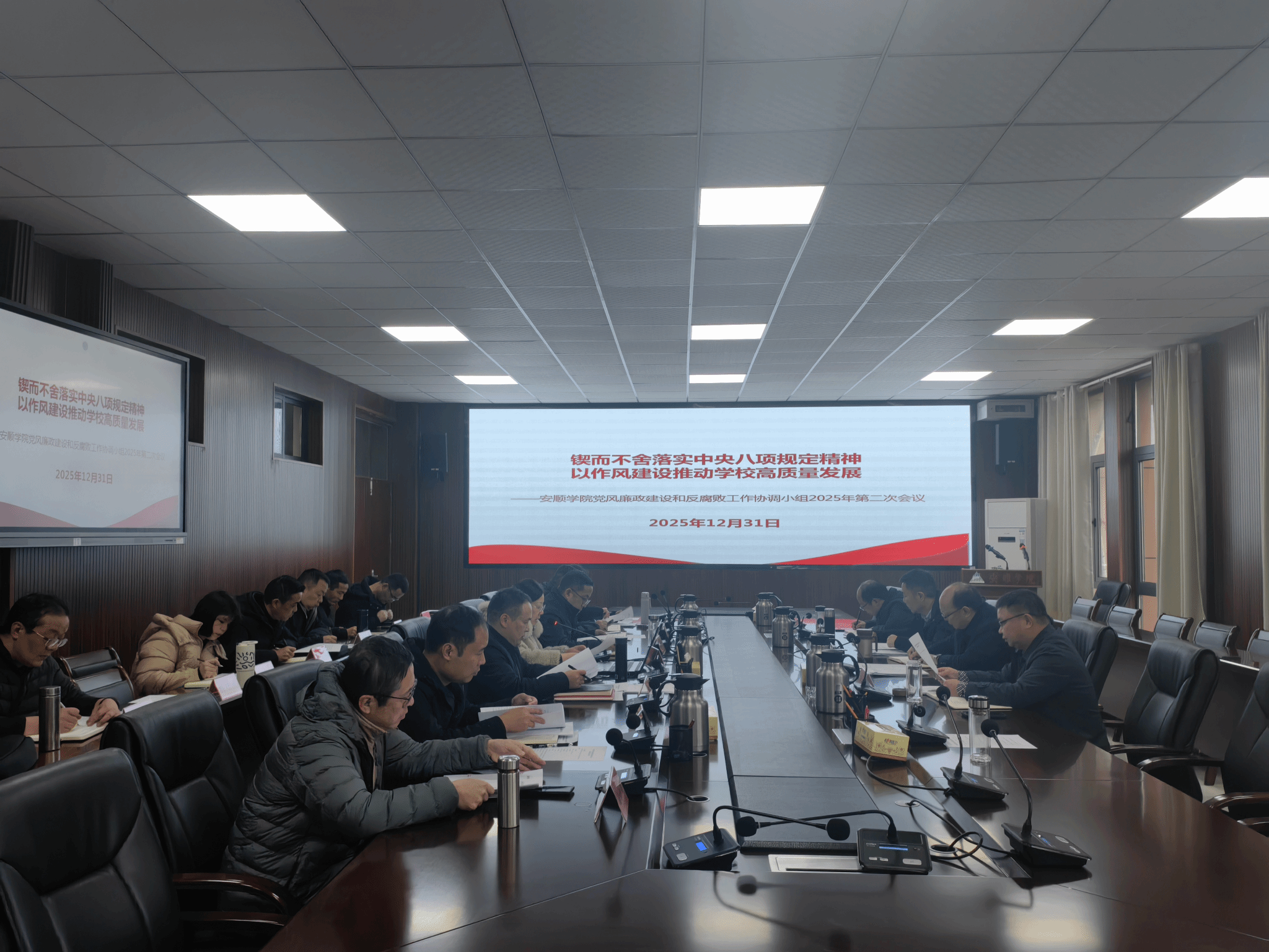 2025年12月31日下午,安顺学院党风廉政建设和反腐败工作协调小组2025年第二次会议在安道楼505会议室召开,会议以“锲而不舍落实中央八项规定精神,以作风建设推动学校高质量发展”为主题。全体在家校领导出席会议,学校党风廉政建设和反腐败工作协调小组成员单位参会,教师工作处、教务处、后勤处、基建处、招就处、科研处、学工部主要负责人列席。会议由学校纪委副书记施渺筱主持。