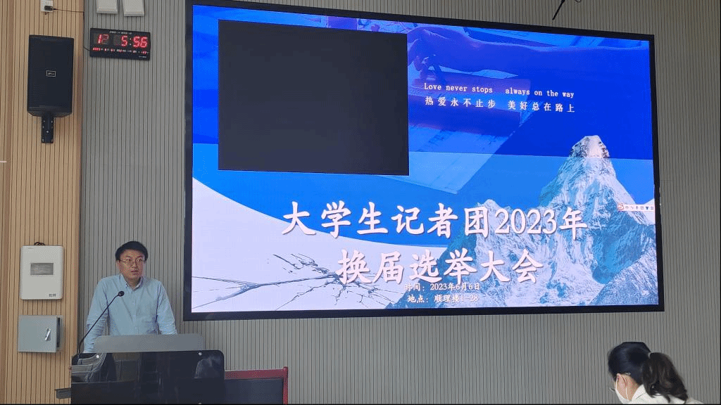 6月6日中午,安顺学院大学生记者团2023年换届选举大会在顺理楼1-28阶梯教室举行。安顺学院党委宣传部副部长白波,大学生记者团指导教师蒋欣原、杨茜出席大会,大学生记者团全体成员参加,大会由秘书长蒋白露主持。