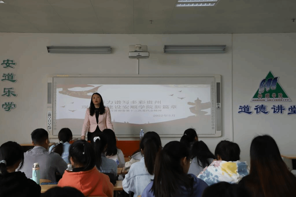 5月16日下午,安顺学院道德讲堂开展“奋力谱写多彩贵州现代化 建设安顺学院新篇章”专题讲座。数计学院书记叶玉莲主讲,数计学院学生到场聆听学习。