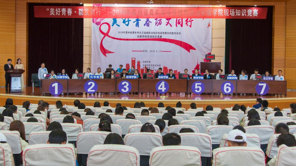 2018年9月17日,由安顺学院主办,安顺学院党委宣传部、安顺学院工会、共青团安顺学院委员会承办的“‘美好青春·防艾同行’—2018年贵州省青年学生艾滋病防治知识电视竞赛系列宣传活动安顺学院现场知识竞赛”在安顺学院学术报告厅举行。安顺学院党委宣传部部长殷红敏、安顺学院工会主席史贤琴、共青团安顺学院委员会副书记胡蕾出席会议并担任大赛仲裁评委。全校14个二级学院经过本院初赛选派代表队参赛。