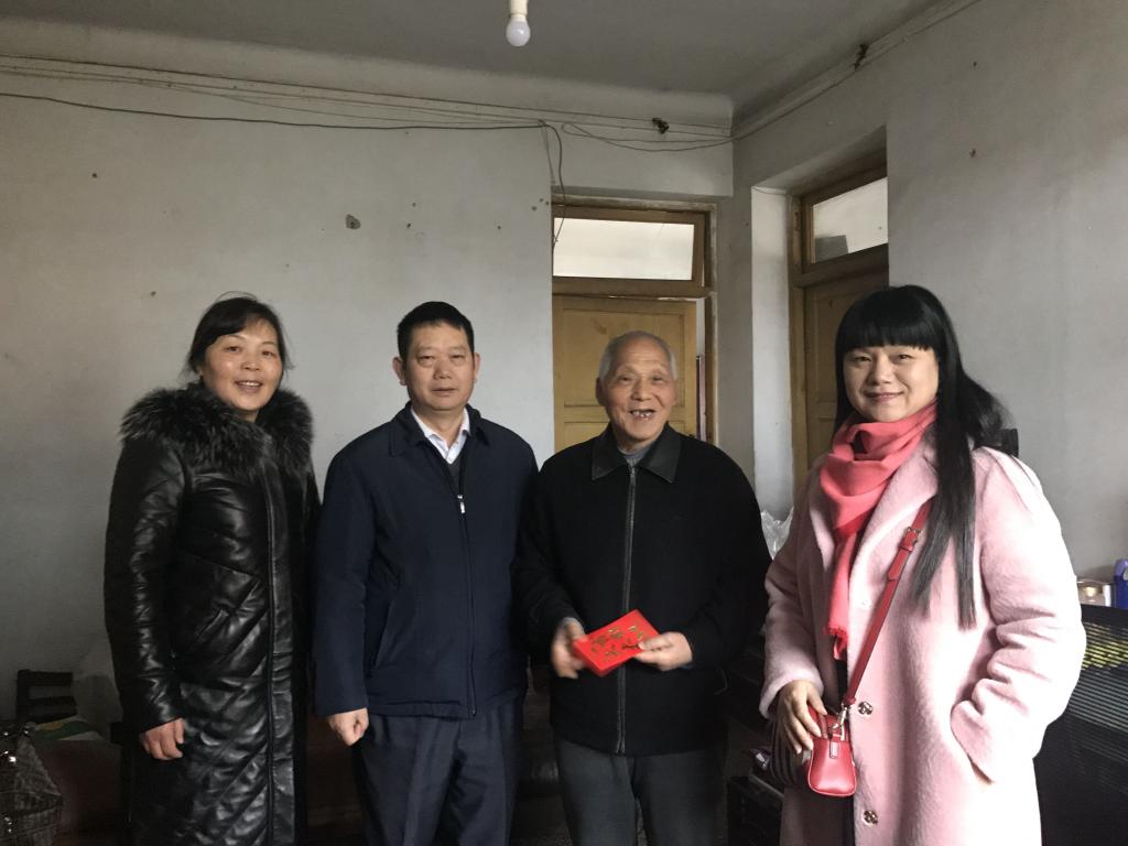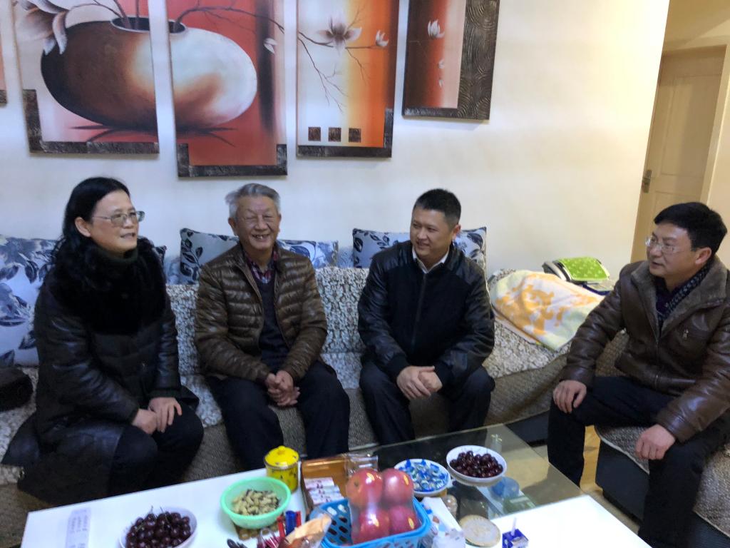 安顺学院党委副书记陶文彩(左二)、党委宣传部部长殷红敏(左一)、工会主席史贤琴(右一)走访慰问离退休老干部杨通邦(右二)