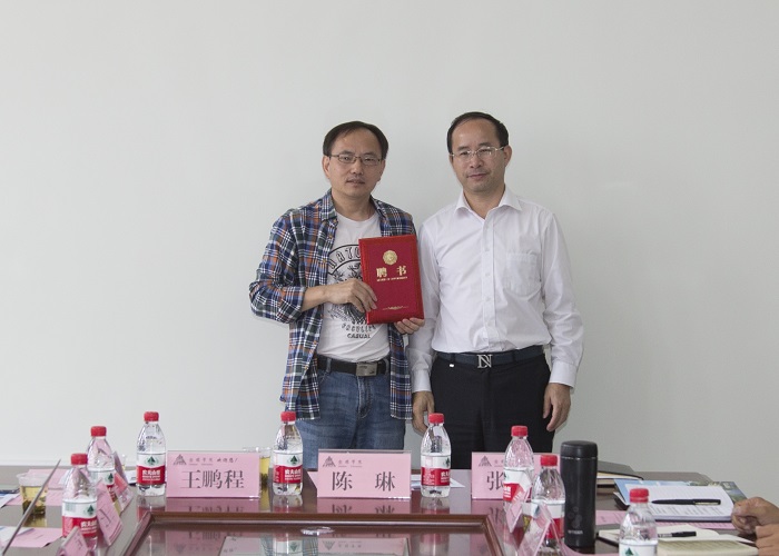 安顺学院党委书记罗荣彬(右)为安顺籍博士、工作站站长程洪兴(左)颁发聘书