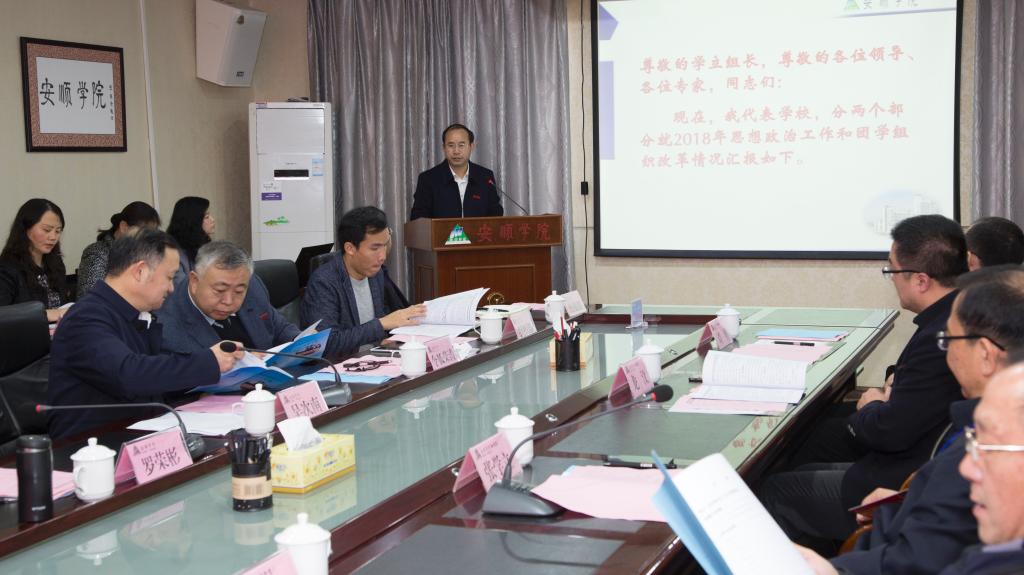 2018年11月29日,以贵州民族大学党委书记张学立为组长,兴义民族师范学院党委副书记李可迅为副组长,贵州大学团委书记龙汶、贵州师范大学求是学院党委书记尹毅、贵州民族大学组织部副部长、党建研究所所长刘勇为成员的贵州省普通高校思想政治教育工作检查专家组一行5人来到我校,对我校思想政治教育工作暨团学组织改革情况进行为期一天的检查。安顺学院党委书记罗荣彬、校长吴次南、党委副书记陶文彩、副校长令狐荣涛,各二级学院、各部、处室部门主要负责人,3位学生家长及思想政治教育工作迎检办成员全程参加检查工作。