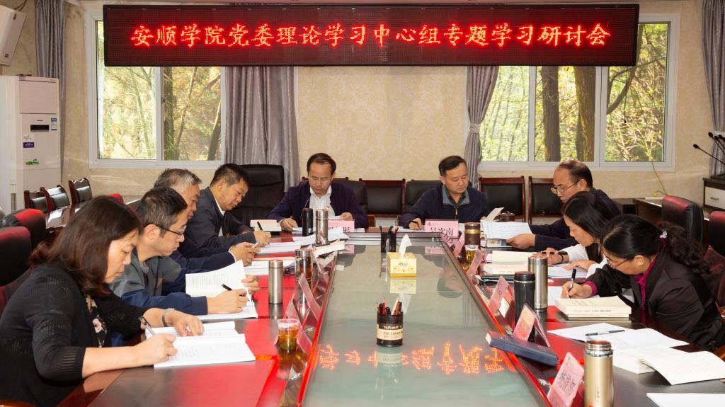 2019年9月27日,安顺学院召开党委理论学习中心组(扩大)专题学习研讨会,专题学习《中共中央关于加强党的政治建设的意见》和《习近平关于“不忘初心、牢记使命”重要论述选编》部分内容,并紧扣开展“不忘初心、牢记使命”主题教育的目标要求,围绕习近平总书记关于教育的重要论述和党的政治建设、全面从严治党、理想信念、宗旨性质、担当作为、政治纪律和政治规矩、党性修养、廉洁自律等8个方面进行研讨发言。