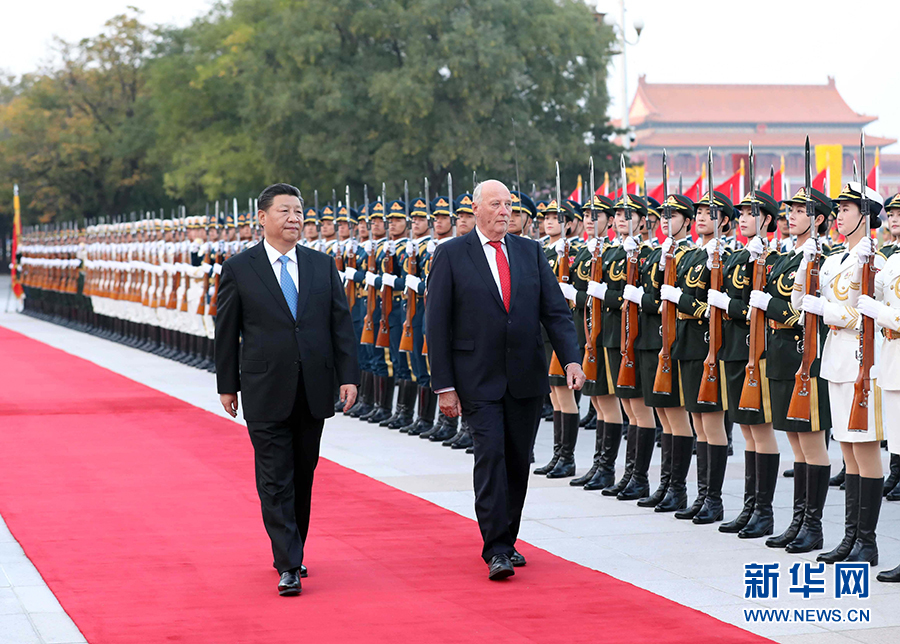 10月16日,国家主席习近平在北京人民大会堂同挪威国王哈拉尔五世举行会谈。这是会谈前,习近平在人民大会堂东门外广场为哈拉尔五世举行欢迎仪式。 新华社记者 刘卫兵 摄