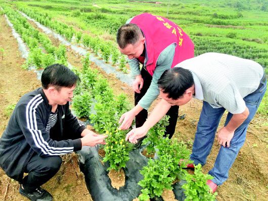 陈文(中)和村干部们查看杭白菊长势情况。