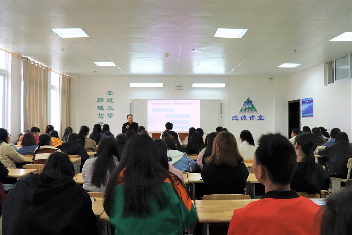 10月15日下午,安顺学院“尚德崇法 义行天下”专题讲座在学校道德讲堂举行。安顺学院旅游学院副院长潘昌盛副教授主讲,外国语学院2018级新生听讲。