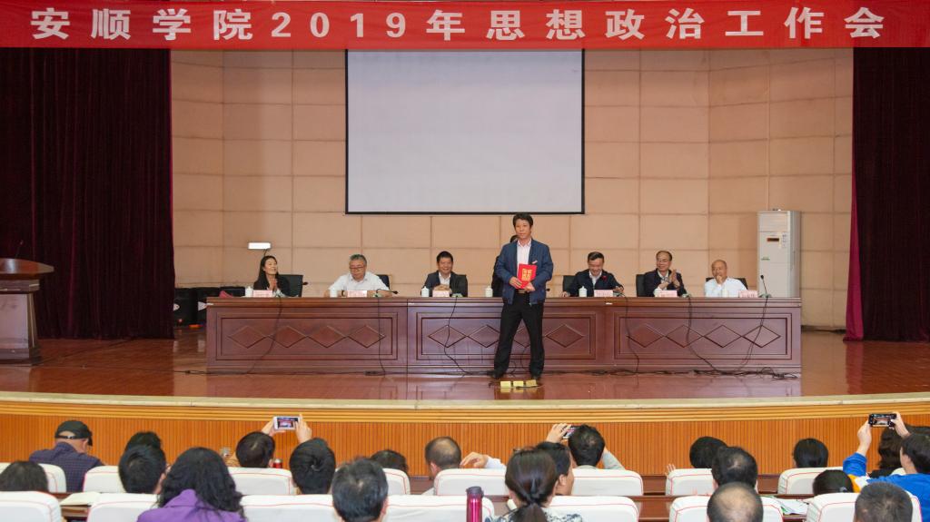 2019年4月29日下午,安顺学院2019年思想政治工作会在学术报告厅隆重召开。安顺学院党委书记罗荣彬,校长吴次南,党委副书记陶文彩,副校长顾名宇、令狐荣涛、郭本华,纪委书记蔡红英,党委各工作部门、大学生思想政治教育工作领导小组和学生工作领导小组各成员部门、各二级学院班子成员,学工部(学生处、武装部)、招就处、学生资助管理中心、团委全体人员,思想政治理论课专职教师,专职组织员,一线专职辅导员、班主任,获奖教师,先进学生集体和优秀学生个人代表,校级学生组织或团体干部代表,各学院团总支、学生会学生干部代表和其他同学代表等参加会议。会议由吴次南校长主持。