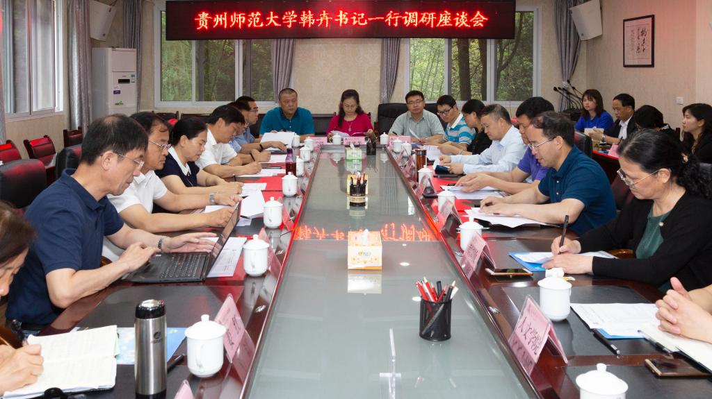 2019年6月14日上午,贵州师范大学党委书记韩卉一行到我校进行调研并召开座谈会。安顺市副市长廖晓龙、安顺学院党委书记罗荣彬、校长吴次南、副厅级长级领导熊国敏出席,安顺学院相关单位负责人参加。座谈会由罗荣彬书记主持。