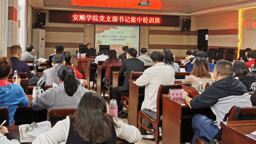 9月25日,安顺学院党支部书记集中轮训班在特教大楼七楼第一会议室开班。安顺学院党委副书记陶文彩、组织部部长何朝越进行了授课,安顺学院各党支部书记参加学习。