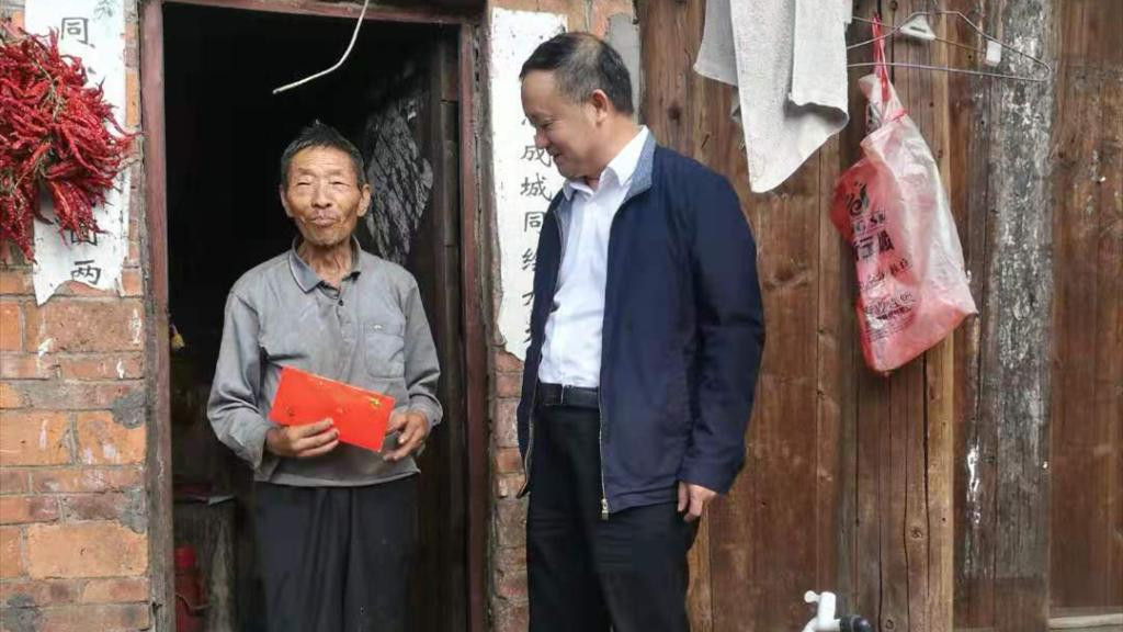 安顺学院校长吴次南(右)慰问困难党员(左)