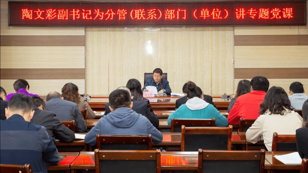 根据“不忘初心、牢记使命”主题教育工作安排,2019年11月5日上午,安顺学院党委副书记陶文彩以《“不忘初心,牢记使命”奋力谱写安顺学院改革发展新篇章》为题,在特教楼会议室讲授专题党课,分管(联系)部门(单位)副科级以上干部、机关党委委员等参加此次专题党课学习。