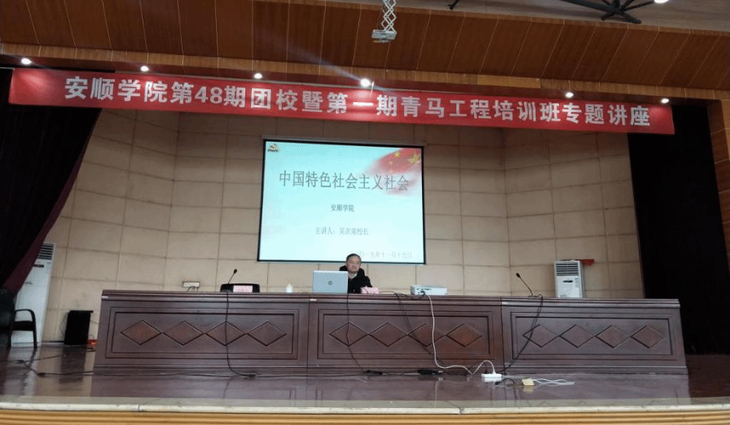 2019年11月19日下午,安顺学院校长吴次南以“中国特色社会主义社会”为主题在学术报告厅为第四十八期团校暨第一期青年马克思主义者工程培训班作专题讲座。讲座由校团委副书记胡蕾主持,700余名学生听讲。