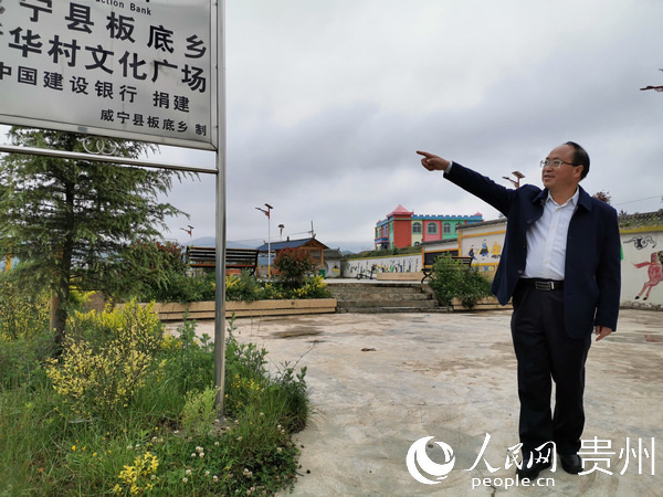 何登亮介绍新华村文化广场建设情况。人民网 王钦 摄