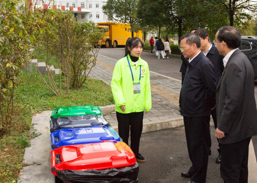 安顺学院志愿者向贵州省副省长胡忠雄一行介绍学校垃圾分类工作开展情况