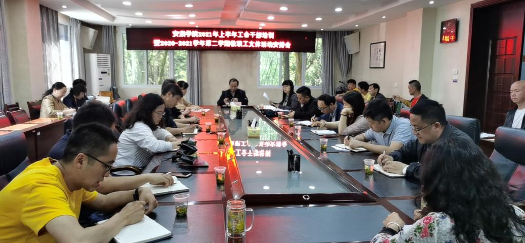 5月10日上午,安顺学院2021年上半年工会干部培训暨教职工文体活动安排会在行政楼二楼会议室召开,安顺学院党委书记罗荣彬、各二级学院党委书记、附中及相关职能部门负责人、各分工会主席和工会全体成员参加会议。