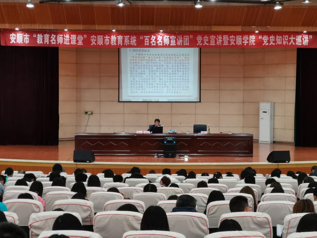 为深入推进党史学习教育,按照《安顺市打造活跃在基层的宣讲队高标准高质量推进党史学习教育“十进”基层宣讲方案》和安顺市教育系统开展“学党史、记嘱托、感党恩、跟党走”专项活动要求,安顺学院面向全校师生开展“教育名师进课堂”、“百名名师宣讲团”党史宣讲和“丹心向党献青春”之“党史知识大巡讲”系列活动。