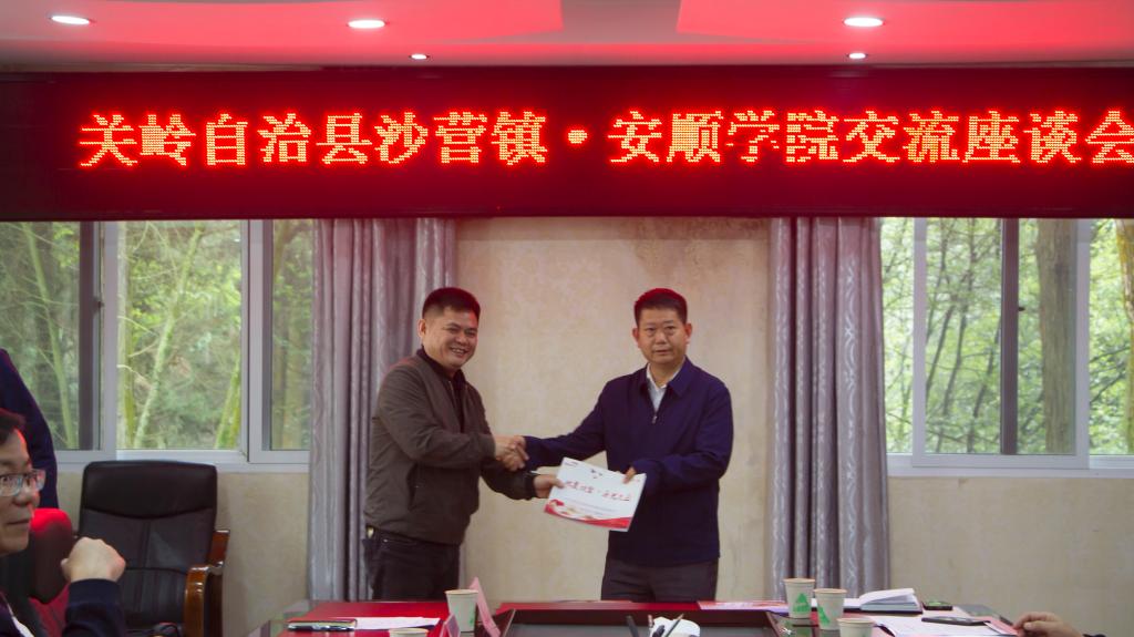 陶文彩讲话。他说,秀云书记一行的到来,使我们记起我校师生与沙营镇干部群众奋力打赢脱贫攻坚战的1800多个日日夜夜。1800多个决战脱贫攻坚的日日夜夜为安顺学院与沙营镇长期合作奠定了基础,也使安顺学院师生与沙营镇干部群众结下了深厚的情谊。今天秀云书记一行来到安顺学院,正值贵州省高校乡村振兴研究中心在安顺学院揭牌的大好时机。我们要以加强安顺学院贵州高校乡村振兴研究中心建设为新的起点,深入贯彻落实习近平总书记视察贵州重要讲话精神,切实增强服务乡村振兴的责任感和使命感,以实际行动弘扬“上下同心、尽锐出战、精准务实、开拓创新、攻坚克难、不负人民”的脱贫攻坚精神,充分发挥高校智力和人才优势,围绕“四新”抓“四化”,积极支持沙营镇扎实做好巩固脱贫攻坚成果同乡村振兴有效衔接,为沙营镇巩固脱贫攻坚成果、促进乡村振兴、奋力开启全面建设社会主义现代化新征程做出应有的贡献,以优异的成绩迎接建党一百周年。(文/图:宣传部 王智勇/娄仁彪)