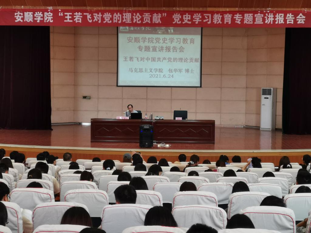 为深入推进党史学习教育,按照安顺市教育系统开展“学党史、记嘱托、感党恩、跟党走”之“丹心向党献青春”专项活动的安排,在安顺学院艺术党课《王若飞》公演之际,面向全校师生举办“王若飞对党的理论贡献”党史学习教育专题宣讲报告会,和广大师生一起重温党史,传承革命先烈王若飞同志的革命精神和理论贡献,践行“一切要为人民打算”的初心使命。6月24日下午,贵州省哲学社会科学重大委托项目《王若飞对中国共产党的理论贡献》课题的主要参与人、安顺市教育系统百名名师宣讲团成员、安顺学院党史学习教育宣讲团成员、马克思主义学院副教授包华军博士以《王若飞对中国共产党的理论贡献》为题,为马克思主义学院全体思想政治理论课教师和以中国共产党历史专业、思想政治教育专业等为代表的全校广大学生600余人,开展了一次详实生动的党史学习教育专题宣讲。