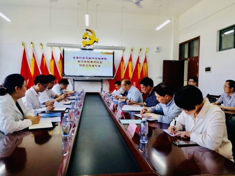 贵州省信息中心书记胡建华、办公室副主任徐磊、中心技术交流与合作外处长袁天志、中心技术交流与合作处工程师余纯、韩露一行五人到安顺学院开展了全国计算机技术与软件专业技术资格(水平)考点设置的各项工作。胡建华一行实地考察了我校计算机实验室及标准化考场的情况,随后到数计学院二楼会议室就考点成立的相关事宜进行座谈。