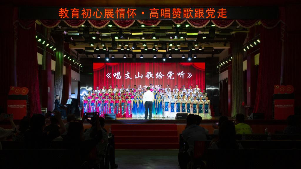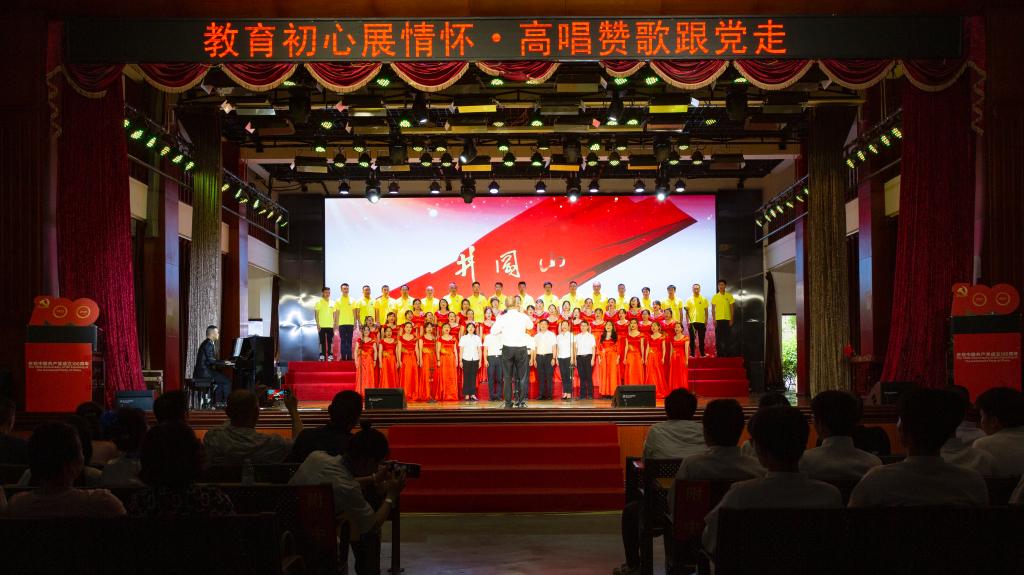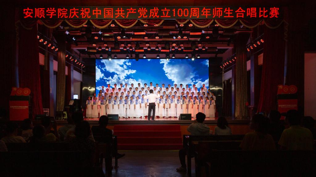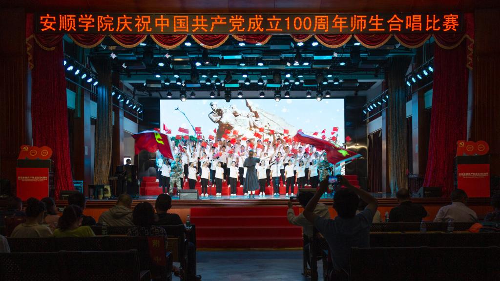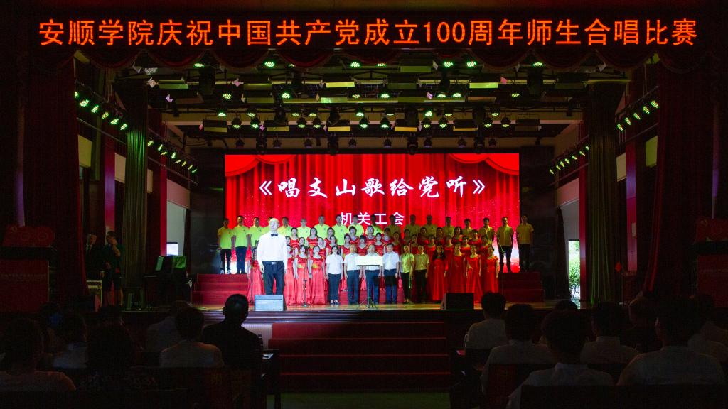 百年风雨兼程,百年卓越辉煌。为陶冶广大师生爱党、爱国、爱校的高尚情操,增强凝聚力,展现校园奋发进取的精神风貌,值此全国上下共同庆祝中国共产党百年华诞之际,6月28日下午,安顺学院在大礼堂隆重举办“教育初心展情怀•高唱赞歌跟党走”庆祝中国共产党成立100周年师生红歌合唱比赛。安顺学院党委书记罗荣彬,党委副书记、校长陈云坤,党委委员、副校长郭本华,党委委员、纪委书记蔡红英,党委委员、副校长韦英,党委委员、副校长 张来,党委委员、党委宣传部部长殷红敏,党委委员、教务处处长杜志明以及各职能部门、各二级学院负责人出席比赛。由全校各分工会组成的16支教职工代表队参加比赛。安顺学院艺术学院教授、中国音乐家协会会员、贵州省音乐家协会会员熊黏,中国合唱协会会员、贵州音乐教育研究会理事、安顺市音乐教育研究会副会长段剑,安顺市教育科学研究所音乐教研员、贵州省教育学会理事、安顺市音乐教育专业委员会副理事长、安顺合唱协会副会长陈洪刚,安顺市第二高级中学音乐高级教师、市级名师工作室主持人、市教育学会音乐教育分会副会长吴玛丽,安顺市第三高级中学音乐一级教师、贵州省合唱协会会员、安顺合唱协会理事会理事陈兴余担任比赛评委。