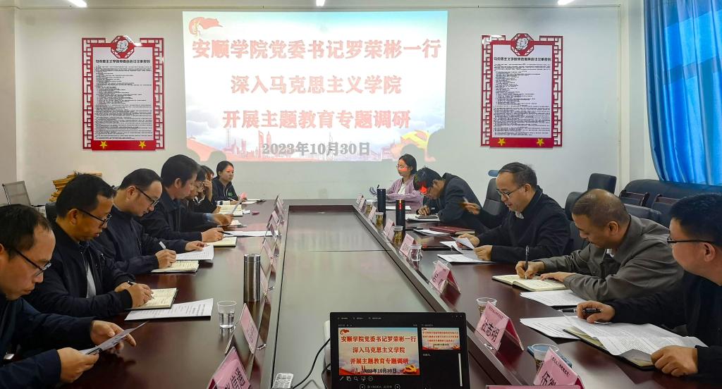 10月30日上午,安顺学院党委书记罗荣彬率党政办、组织部、宣传部、教务处、发规处等部门负责人到马克思主义学院开展学习贯彻习近平新时代中国特色社会主义思想主题教育调研,省委第四巡回督导组吕骥同志出席调研座谈会。调研围绕党建工作和思想政治工作展开,马克思主义学院领导班子、党支部书记、高层次人才代表、教师代表、学生代表参加调研座谈。