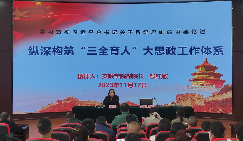 11月17日,安顺学院党委委员、副校长殷红敏以“学习贯彻习近平总书记关于系统思维的重要论述 纵深构筑‘三全育人’大思政工作体系”为题,为学校分管学院、职能部门以及所在支部的全体教师党员作专题党课。党委委员、组织部部长何朝越主持会议。