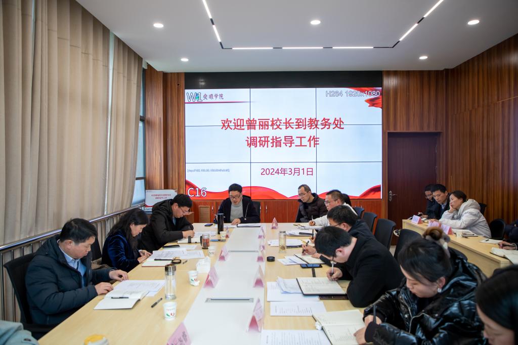2024年3月1日,安顺学院校长曾丽到教务处、教学质量监测与评估中心调研指导工作。安顺学院副校长张来、党政办公室主任马明陪同调研,教务处、教学质量监测与评估中心全体人员参加会议。