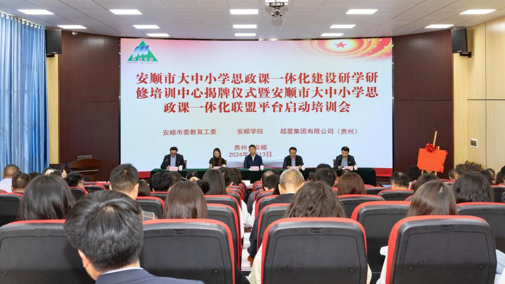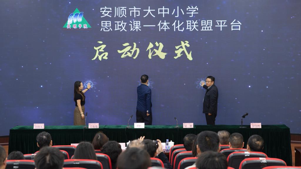在揭牌仪式上,陶文彩、晏雄为“安顺市大中小学思政课一体化建设研学研修培训中心”揭牌。随后,安顺市委教育工委(市教育局)领导、安顺学院领导、超星集团项目负责人共同点亮大屏,正式启动安顺市大中小学思政课一体化联盟平台。