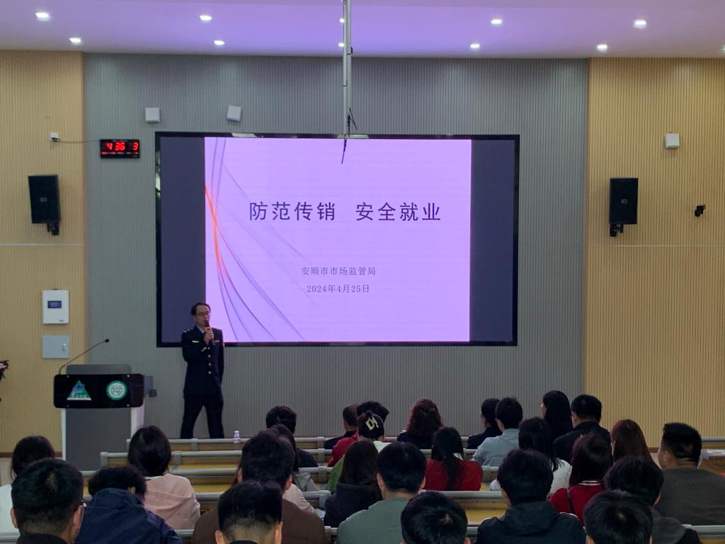 4月20日至26日是全国知识产权宣传周,为全面贯彻落实党的二十大和二十届二中全会精神,深入贯彻落实习近平总书记关于知识产权工作的重要指示论述精神,全面加快知识产权强国建设,在第24个世界知识产权日来临之际,4月25日安顺学院联合安顺市市场监管局(知识产权局)在第24个世界知识产权日来临之际共同举办了知识产权宣传周活动,为学校师生带来了形式多样的宣传活动,安顺学院招就处处长罗瑜、安顺学院科研处副处长李魁印、安顺学院保卫处副处长陈泽禾出席并参加活动。安顺市市场监管局(知识产权局)反不正当竞争与直销监管科科长娄鹏飞作《防范传销 安全就业》专题讲座、贵州昀博知识产权代理有限公司总经理张利秋作《知识产权保护与专利挖掘》专题讲座。