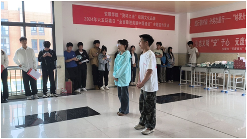 为进一步加强安顺学院生态文明宣传教育,深入学习宣传贯彻习近平生态文明思想,引导全社会牢固树立和践行绿水青山就是金山银山的理念,努力提高广大师生生态文明意识,2024年6月5日下午,安顺学院师生围绕2024年六五环境日“全面推进美丽中国建设”主题,开展了“资环之光”校园文化品牌系列环境保护宣传活动。