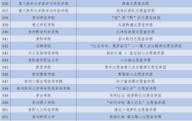 近日,由团中央青年志愿者行动指导中心、中共遵义市委、共青团贵州省委联合开展的2024年全国大学生遵义会议精神志愿宣讲团入选团队名单公布,共有来自全国722所高校的1000支大学生志愿服务团队入选。安顺学院“红色传承,遵梦前行”——遵义会议精神志愿宣讲团成功入选。