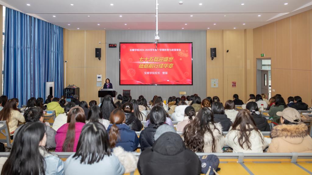 2024年12月19日下午,安顺学院校长曾丽教授在顺理楼阶梯教室为部分大三学生作题为“七十五载迎盛世,砥砺前行续华章”的形势政策报告。