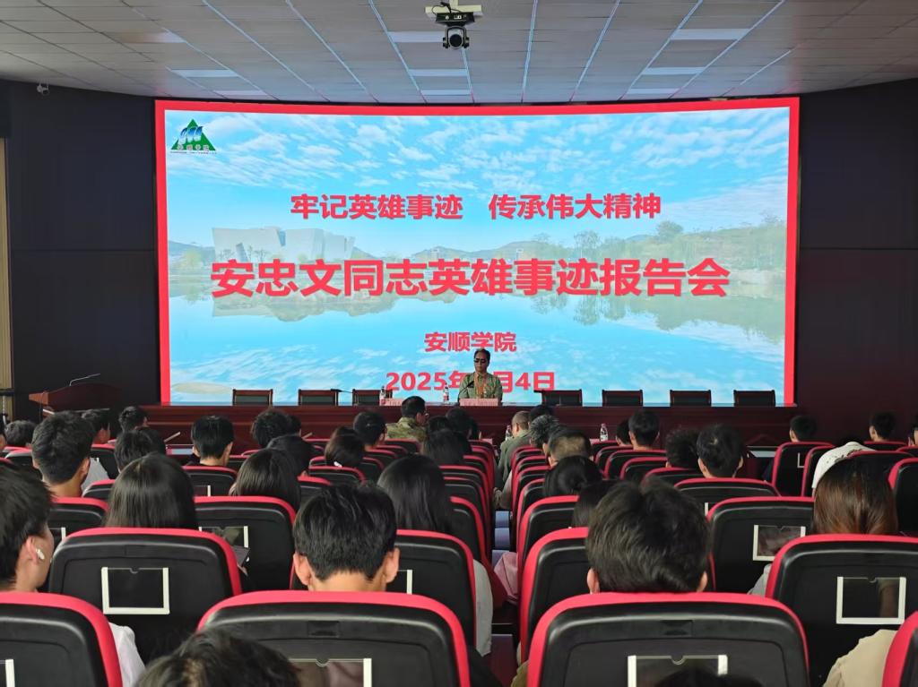 近日,安顺学院举办安忠文英雄事迹专场报告会,学校师生代表近200人参加。报告会前,安顺学院党委副书记李琳会见安忠文一行,感谢安忠文同志到校为师生作报告,感谢安顺军分区对学校国防教育和爱国主义教育的关心和支持。