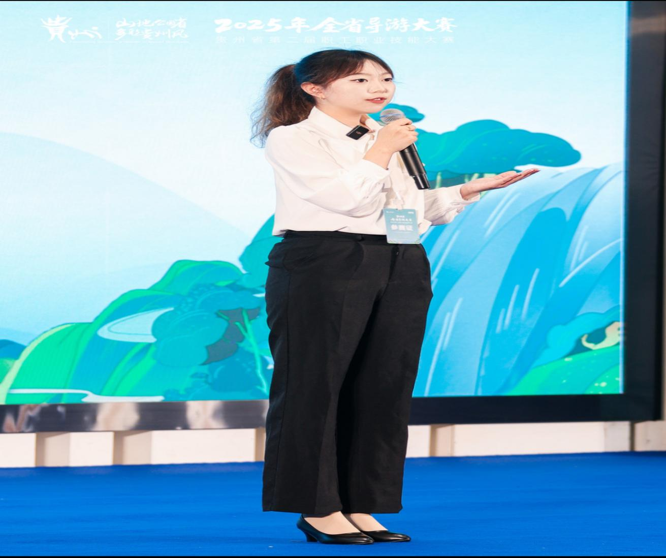 赵锴嫦在备赛过程中深度结合专业特色,将贵州非物质文化遗产与英语讲解技巧有机融合。在主题推介环节,她以“坝凌河桥梁博物馆”为题,展现了贵州“桥梁博物馆”的独特魅力。她在导游词创作环节聚焦水族端节,深入介绍了这一国家级非物质文化遗产。在实地模拟带团环节,赵锴嫦凭借扎实的知识储备和灵活的应变能力,带领游客穿梭在青岩古镇的街巷中。在英语对抗讲解中,她凭借流利的口语表达和精准的文化阐释,精彩阐释了贵州民族文化。