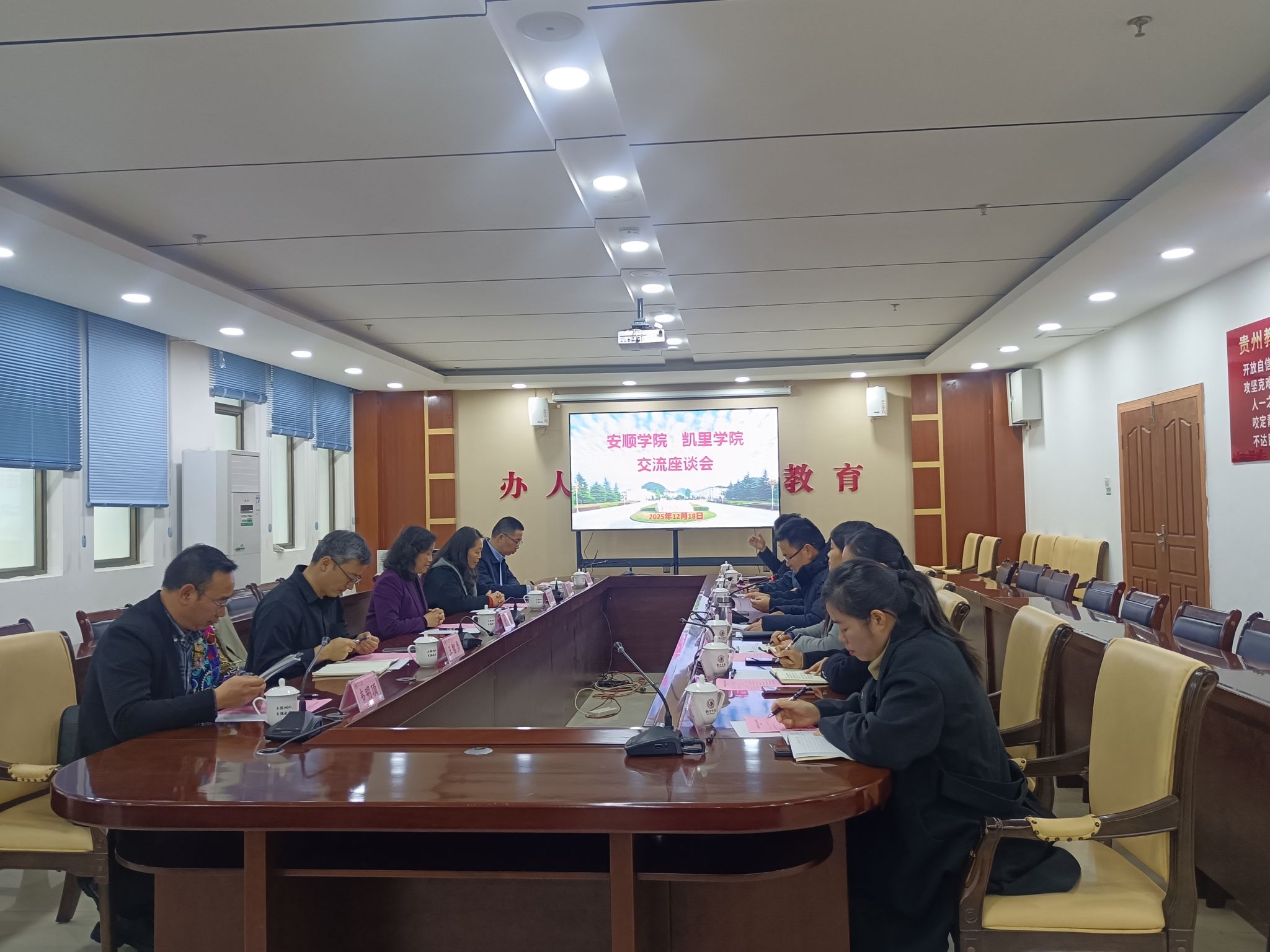 2025年12月18日下午,安顺学院校长曾丽、副厅级干部殷红敏一行赴凯里学院开展交流座谈,凯里学院党委副书记、校长龙健,党委常委、副校长米小其及两校旅游相关院系负责人参会,座谈会由米小其主持。