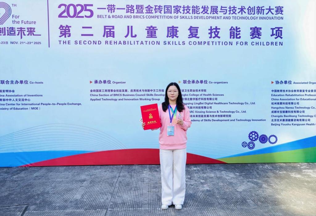 2025年11月21日至23日,2025“一带一路”暨金砖国家技能发展与技术创新大赛第二届儿童康复技能赛项在宁波卫生职业技术学院成功举办。安顺学院特殊教育学院2023级特殊教育专业2班学生吴昌蓉在比赛中凭借出色的专业综合能力,荣获孤独症赛道本科组全国三等奖的佳绩,充分展示了学校在应用型康复人才培养方面的能力。