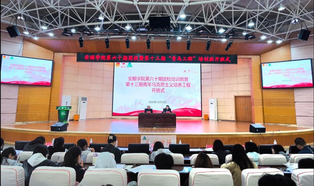 2025年10月28日上午,安顺学院第六十期团校暨第十三期“青马工程”培训班开班式于学术报告厅举行。安顺学院党委常委、副校长孙向阳出席仪式、安顺学院校团委全体教师、各学院团总支负责人、第六十期团校暨第十三期“青马工程”培训班全体学员参加。校团委副书记张丽主持本次仪式。