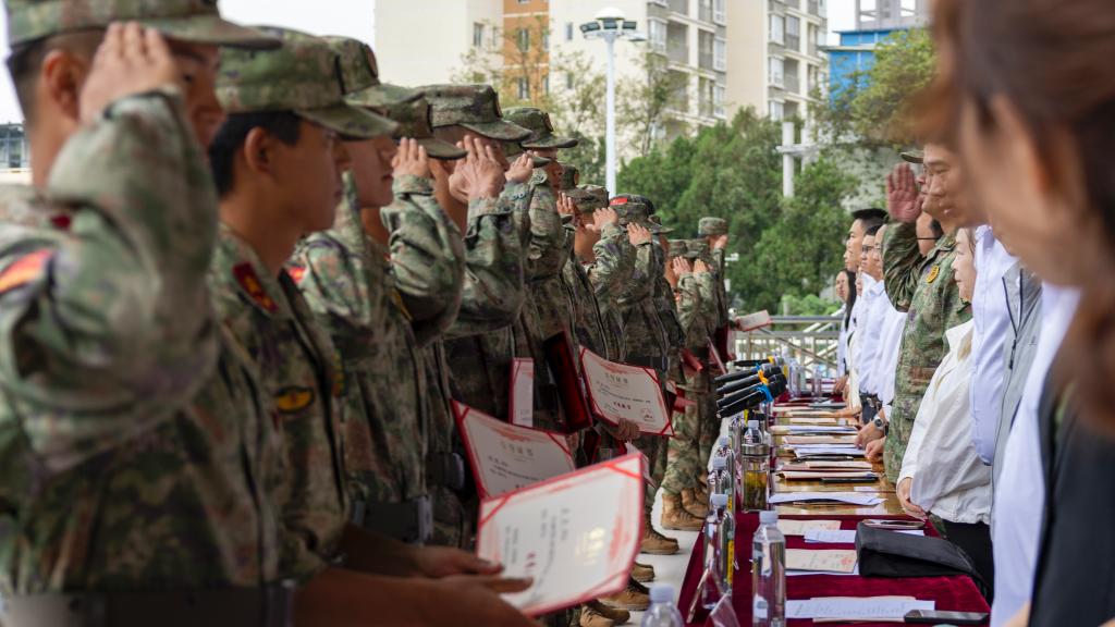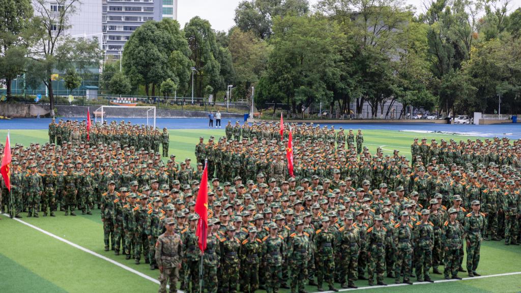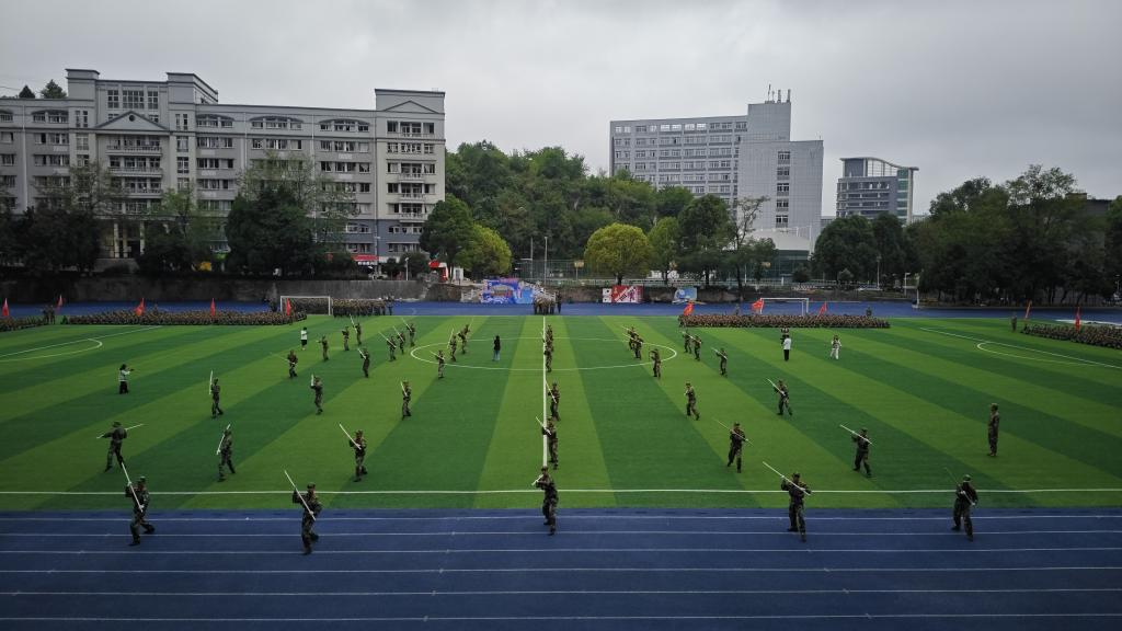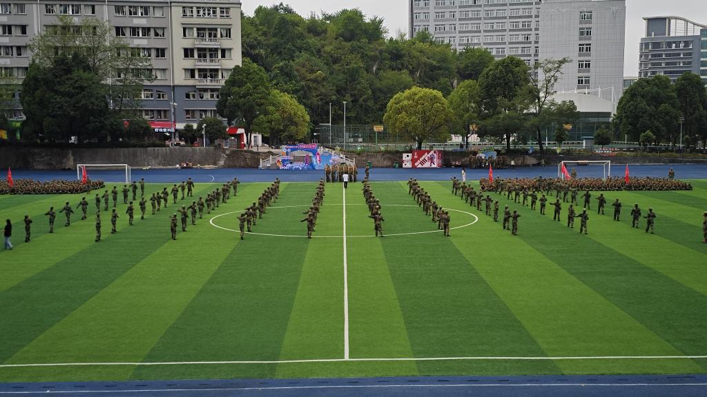 会场响起激昂雄壮的《中国人民解放军军歌》,嘹亮的歌声回荡在运动场,彰显着参训学生学员昂扬的精神面貌。