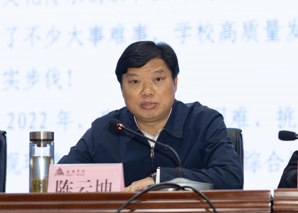 陈云坤就2023年的形势和任务提出三点希望,一是各级领导干部要努力成为社会主义政治家;二是高校教师要努力成为社会主义教育家;三是全体教职工要牢固树立底线思维,筑牢学校安全稳定防线。
